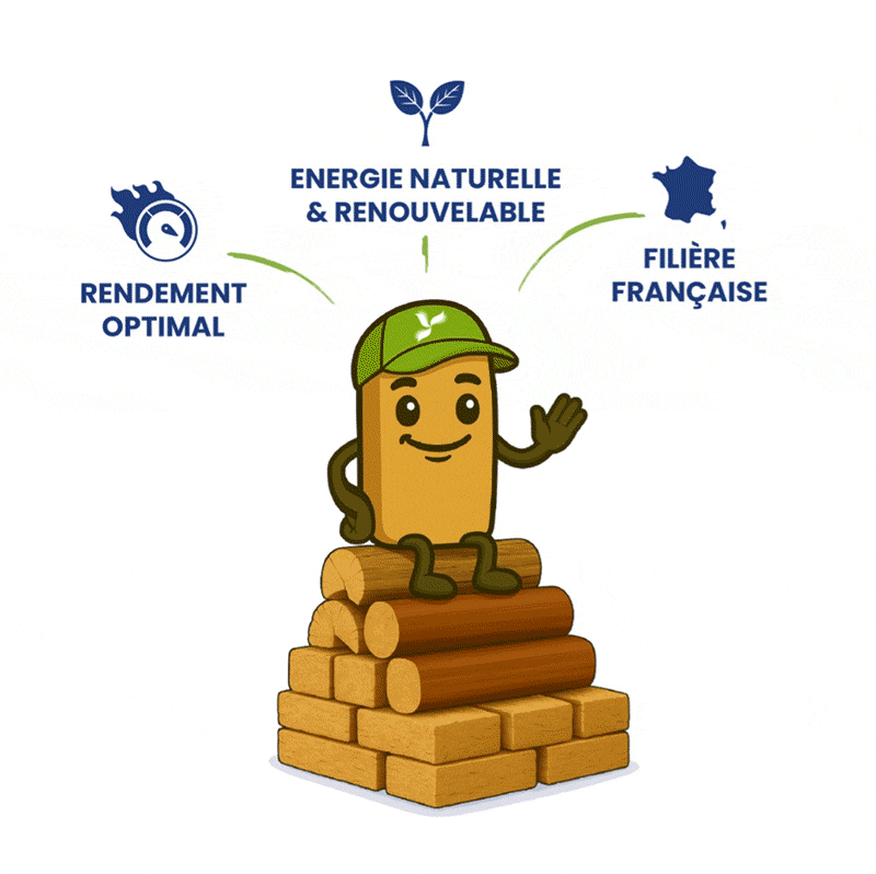 Compo. : Bûches rondes densifiées composée de 100% de sciures et copeaux de bois non traités