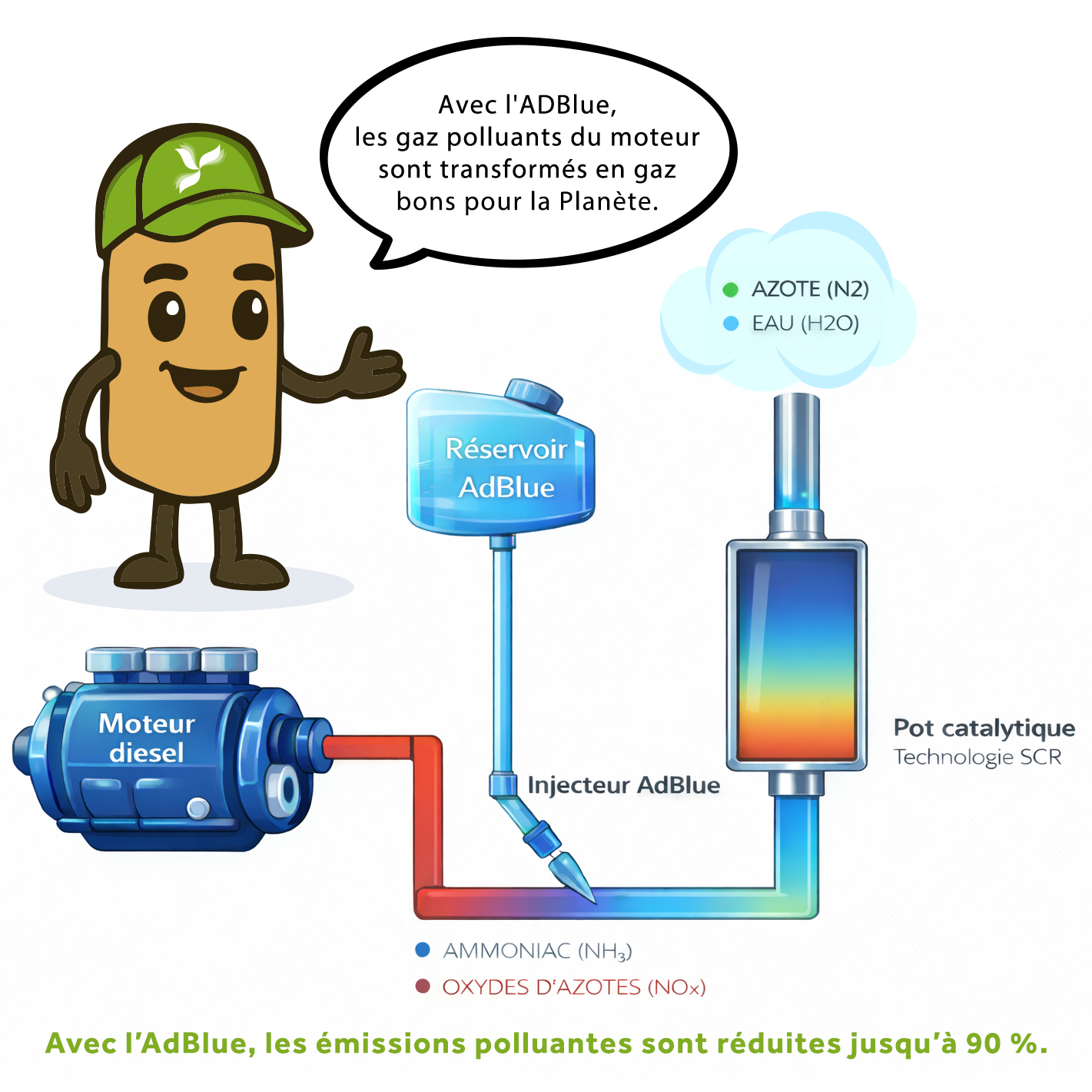 L’AdBlue® est une solution d’urée très pure utilisée pour réduire chimiquement les émissions polluantes (NOx) des moteurs diesel (norme qualité ISO 22241).